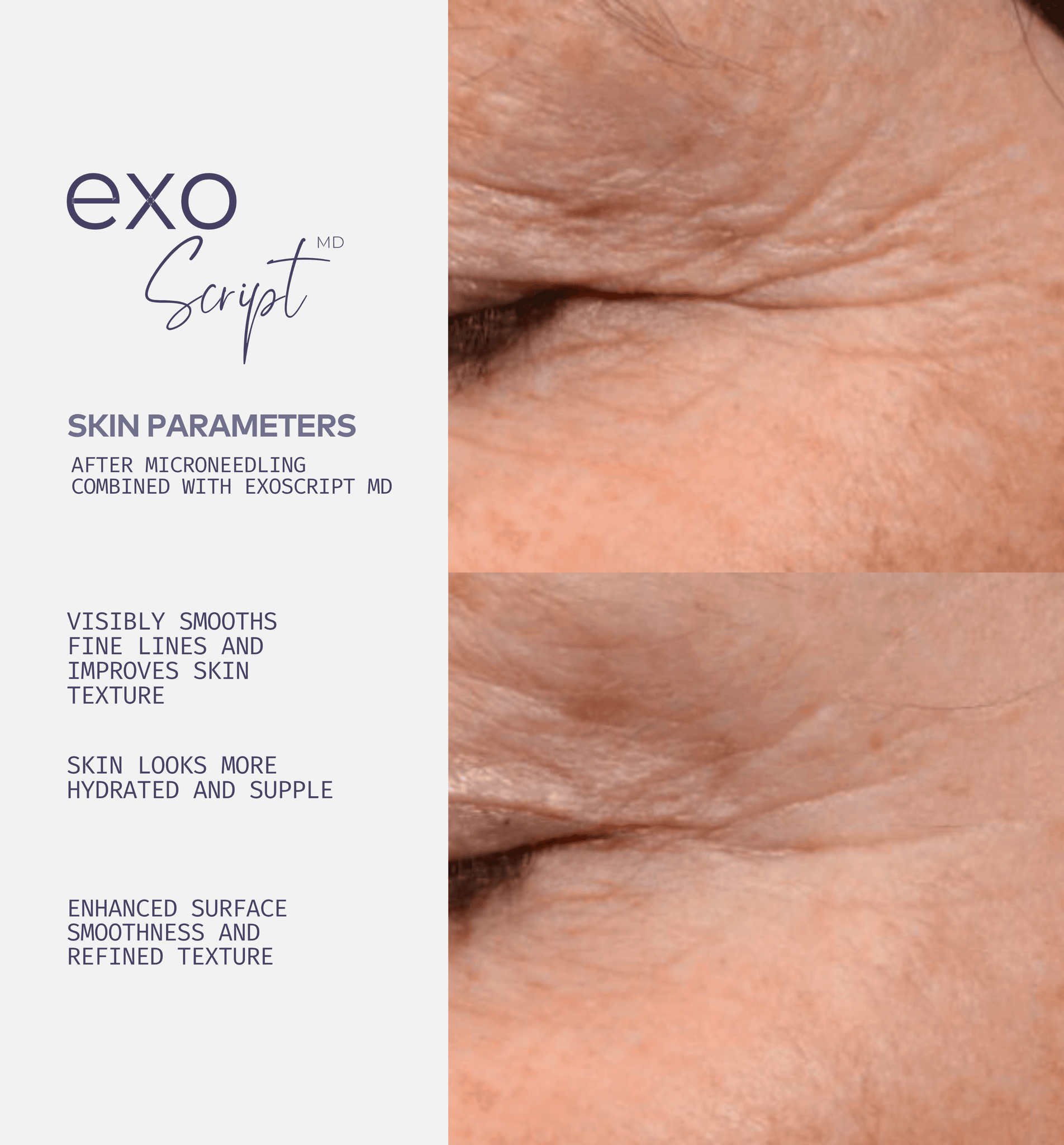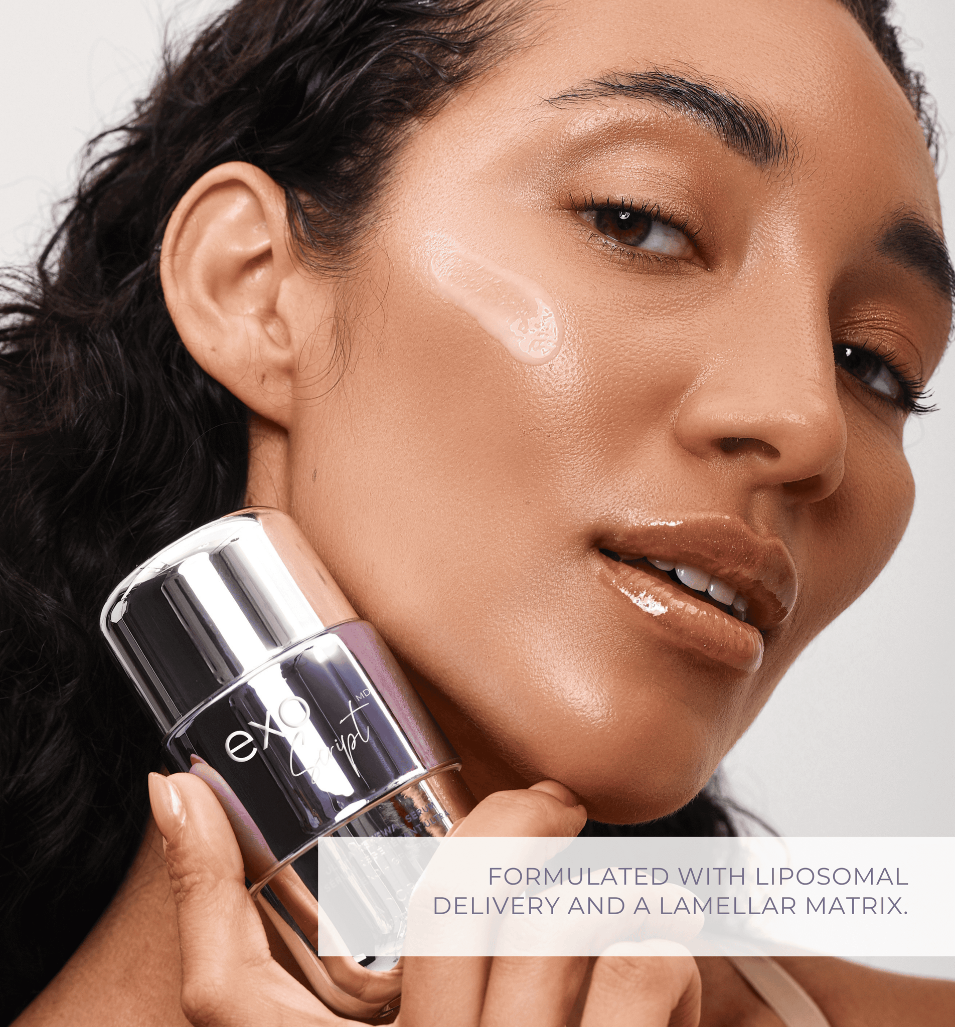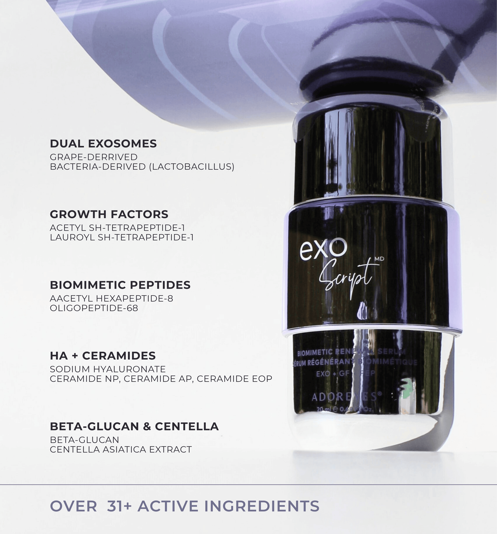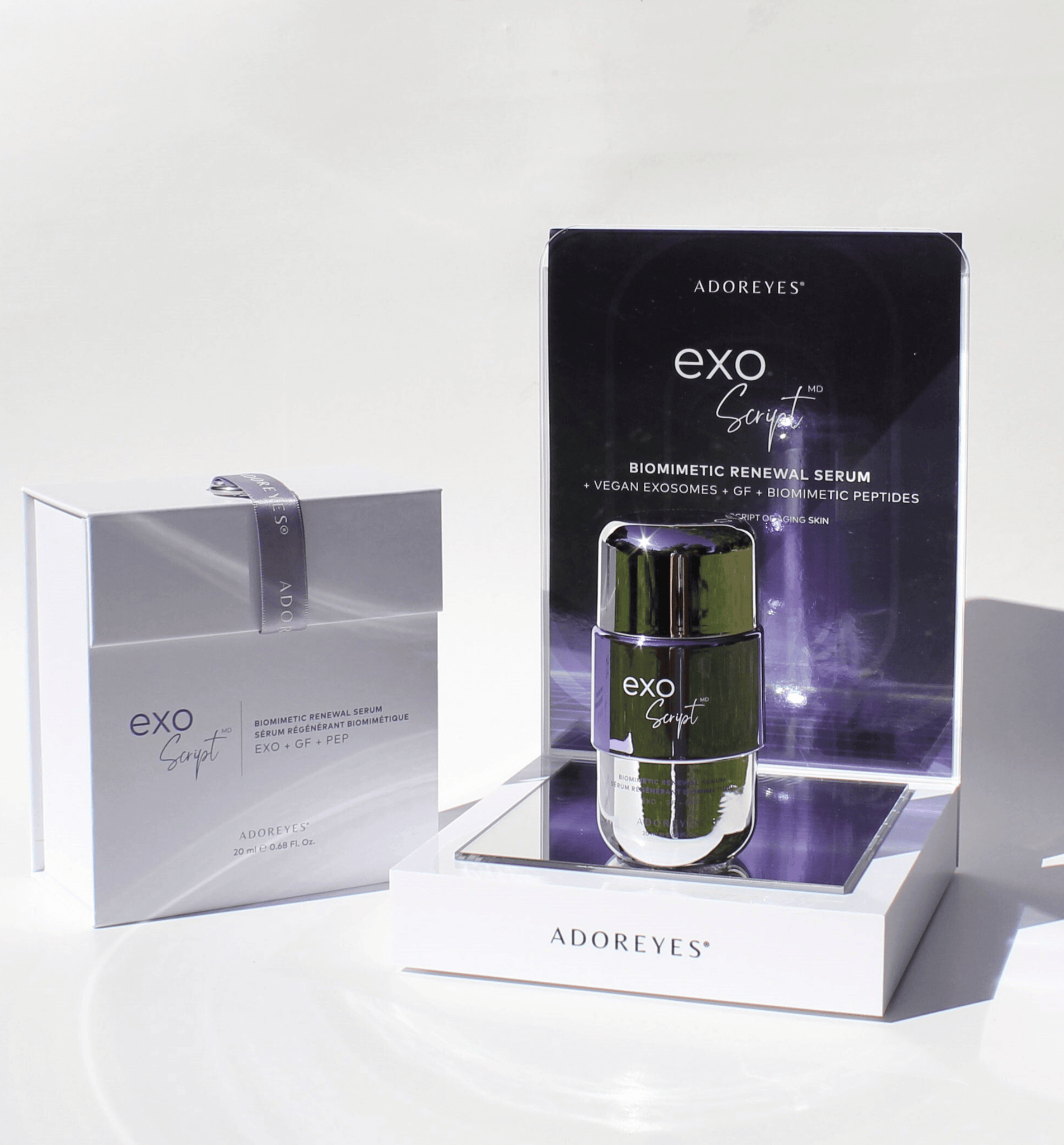ExoScript™ MD Biomimetic Renewal Serum features a first-of-its-kind dual exosome technology, combining vegan bacterial exosomes with ADOREYES proprietary grape-derived exosomes, developed in Canada through precision biotechnology. This advanced delivery system works on the surface of the skin to visibly improve firmness, smoothness, and radiance, while supporting a healthier-looking skin barrier.